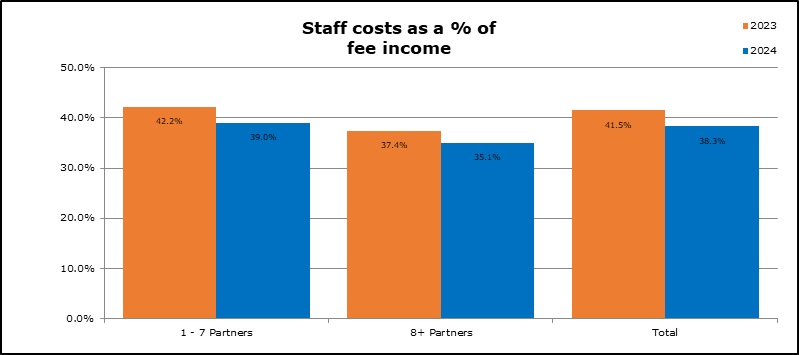 Rent and rates as a percentage of fee income have remained unchanged at 3.9%. This suggests that this has now stabilised following the trend for firms to actively reduce office space as a result of offering more home and hybrid working.