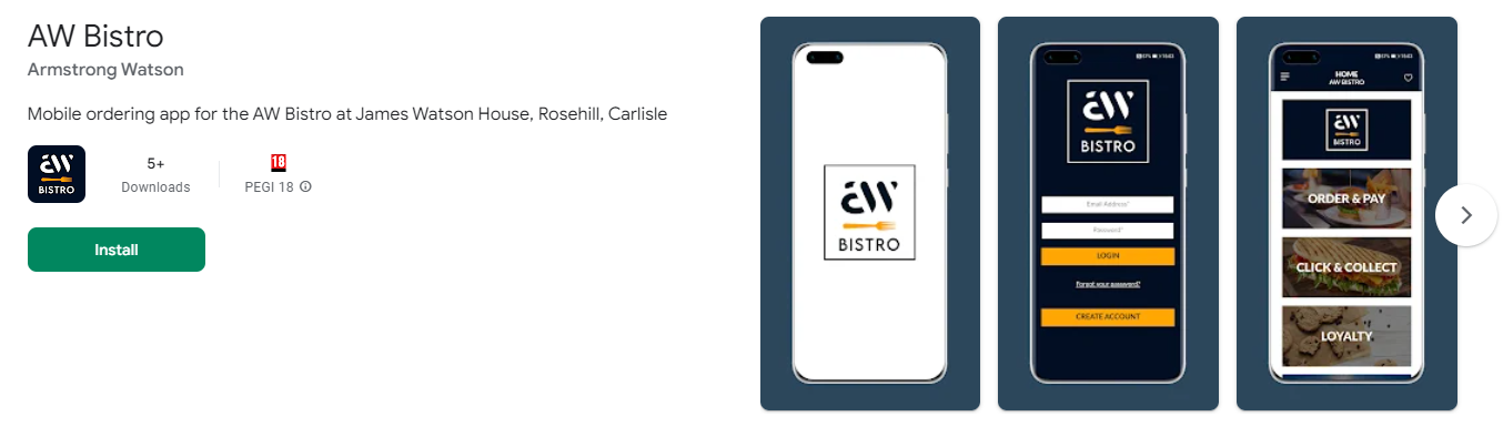 Download the free App on your phone via the App Store for iPhone users or Google Play for android users by searching ‘AW Bistro’. Once downloaded, press ‘create account’ and fill out the form using your details.