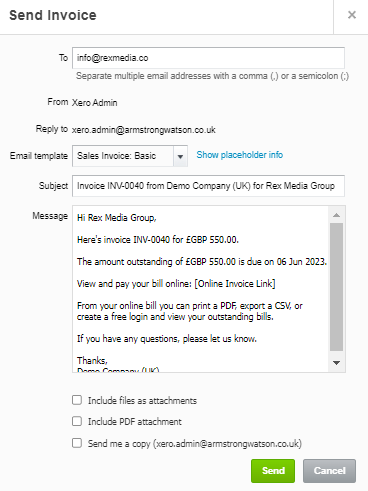 In the ‘Business’ menu, select ‘Invoices’. Find and open the invoice you want to share. If the invoice is: ‘Draft’ or ‘Awaiting approval’ status, click ‘Email’. Check that you’ve inserted the online invoice link, then click ‘Send’.